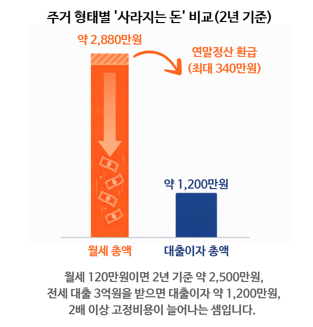 그래프를 보시면 알 수 있듯, 월세 120만 원은 연말정산 환급을 최대치(약 340만 원)로 받아도 2년이면 약 2,500만 원, 4년 뒤에는 무려 5,000만 원이라는 거금이 증발하게 됩니다. 이는 수도권 아파트의 청약 계약금을 한 번에 치를 수 있는 소중한 종잣돈입니다.